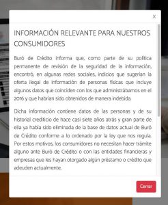 “Dicha información contiene datos de las personas y de su historial crediticio de hace casi siete años atrás y gran parte de ella ya había sido eliminada de la base de datos actual de Buró de Crédito conforme a lo ordenado por la ley que nos regula. Por estos motivos, los consumidores no necesitan hacer trámite alguno ante Buró de Crédito o con las entidades financieras y empresas que les hayan otorgado algún préstamo o crédito que adeuden actualmente”, dijo el Buró de Crédito.