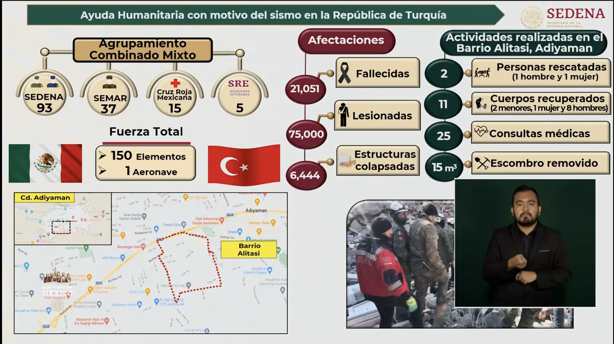 Sandoval reportó que los esfuerzos mexicanos están enfocados en el barrio de Alitasi, en la ciudad de Adiyaman. Entre las personas halladas con vida, son un hombre y una mujer, aún no se ha confirmado el género de la tercera persona.
