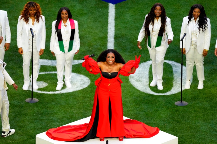 Sheryl Lee Ralph canta "Lift Every Voice", conocida como el himno estadounidense negro, antes del Super Bowl 57 de la NFL entre los Chiefs de Kansas City y los Eagles de Filadelfia, el domingo 12 de febrero de 2023, en Glendale, Arizona. Foto: Charlie Riedel, AP.