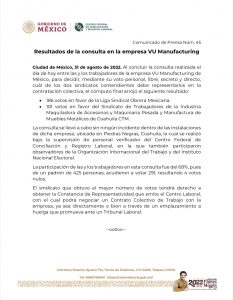 La Secretaría del Trabajo indicó en un comunicado que “Manufacturas VU está obligada a negociar de buena fe con la Liga Sindical Obrera Mexicana, por lo que deberá brindar las facilidades necesarias a sus representantes y asesores para que ingresen a las instalaciones, participen en las negociaciones e informen a las personas trabajadoras los resultados de las mismas”.