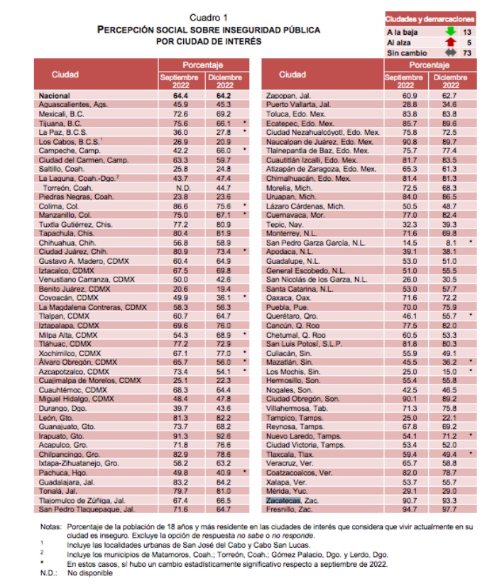 De acuerdo con la más reciente Encuesta Nacional de Seguridad Pública Urbana (ENSU), correspondiente al cuarto trimestre de 2022, las ciudades con mayor porcentaje de población que se siente insegura fueron Fresnillo (97.7 por ciento), Zacatecas (93.3 por ciento), Irapuato (92.6 por ciento), Naucalpan de Juárez (89.7 por ciento), Ecatepec de Morelos (89.6 por ciento) y Ciudad Obregón (89.2 por ciento). Es decir, dos ciudades del estado de Zacatecas encabezan los índices de percepción de inseguridad.