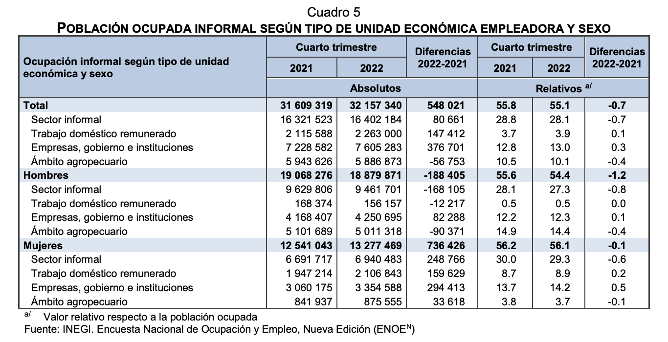 Los resultados de la Encuesta Nacional de Ocupación y Empleo del Inegi indican que, en el cuarto trimestre de 2022, la suma de las personas en todas las modalidades de empleo informal fue de 32.2 millones. Esto es el 55.1 por ciento del total de la población ocupada, que fue de 60.1 millones de personas.