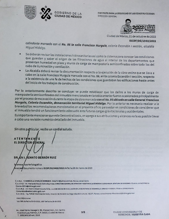 El dictamen, que fue entregado a los vecinos en octubre de 2022, concluye que "los daños a los muros de carga de mampostería semiconfinados del inmueble fueron ocasionados principalmente por el proceso de excavación durante la etapa de la obra marcada con el número 86, ubicado en la calle General Francisco Murguía, colonia Escandón, demarcación Miguel Hidalgo". Por lo anterior, el Instituto ordenó a la Alcaldía "revisar las instalaciones hidrosanitarias, así como la cisterna para conocer las condiciones que guardan y saber el origen de las filtraciones de agua al interior de los departamentos que presentan humedad en pisos y muros de carga de mampostería semiconfinados, sobre todo los del cubo de iluminación y ventilación. La Alcaldía deberá revisar la documentación respecto a la ejecución de la obra vecina para dar fe de las condiciones que guardan las edificaciones hasta antes antes del inicio de los trabajos de construcción".