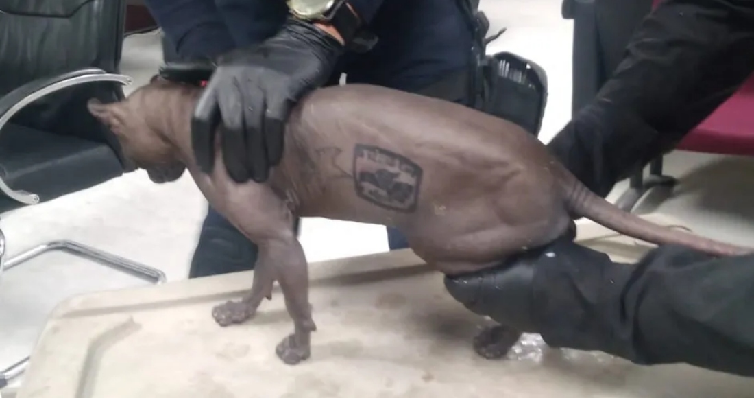 Policías del grupo K-9 que atraparon al felino, color café, de la raza Egipcia, reportaron que llevaba en su cuerpo la leyenda “Hecho en México”, que usa la banda criminal.
