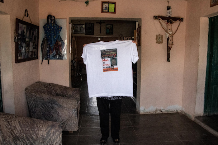 La madre de José muestra una playera del colectivo Zacatecanos y Zacatecanas por la Paz con el rostro de su hijo. Foto: Adolfo Valtierra, A dónde van los desaparecidos