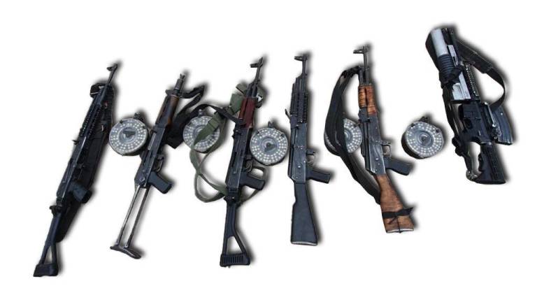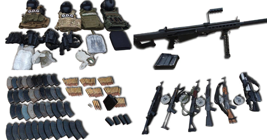 En ese momento procedieron a aterrizar; interceptaron a los tres hombres y lograron asegurar siete armas largas, una de ellas tipo Barrett calibre 50, aditamento lanzagranadas, un arma corta, dos granadas, decenas de cargadores y municiones, cascos y chalecos tácticos, además de hierba parecida a la mariguana.