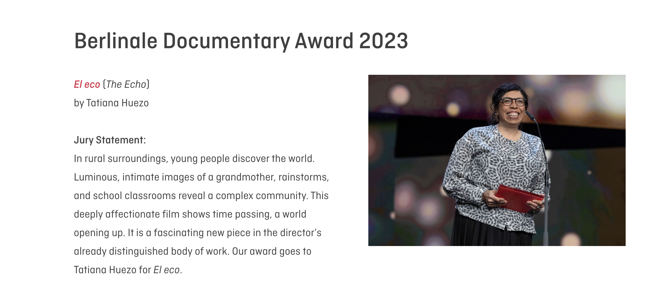 Por su parte, Huezo, cuyo documental fue proyectado un día después de la inauguración de la Berlinale, retrata un pequeño pueblo en Puebla, en el que captura la cotidianidad de dicha comunidad y su labor en el campo. El premio llega justo meses después de recibir excelentes críticas por su película Noche de fuego (Netflix).