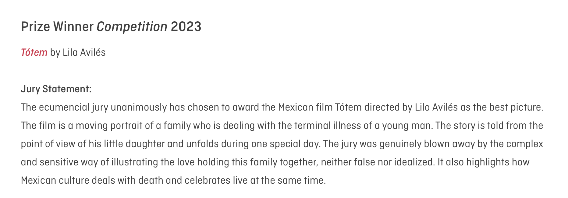 Además de Huezo, la también mexicana Lila Avilés fue condecorada con el premio del Jurado Ecuménico en la sección Encuentros por Tótem en el prestigioso Festival Internacional de Cine de Berlín.