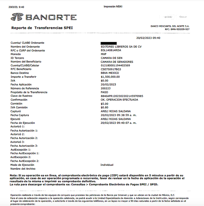 Si bien en la PNT ya aparece el reembolso hecho a la Cuenta Banorte por 1 millón 500 mil pesos, en los archivos que fueron descargados directamente de la PNT (documentos que tienen fecha de creación) no viene indicada ni una sola modificación al contrato ni tampoco los formatos en donde la administración del Senado pide el reembolso a Editores Libreros SA de CV.