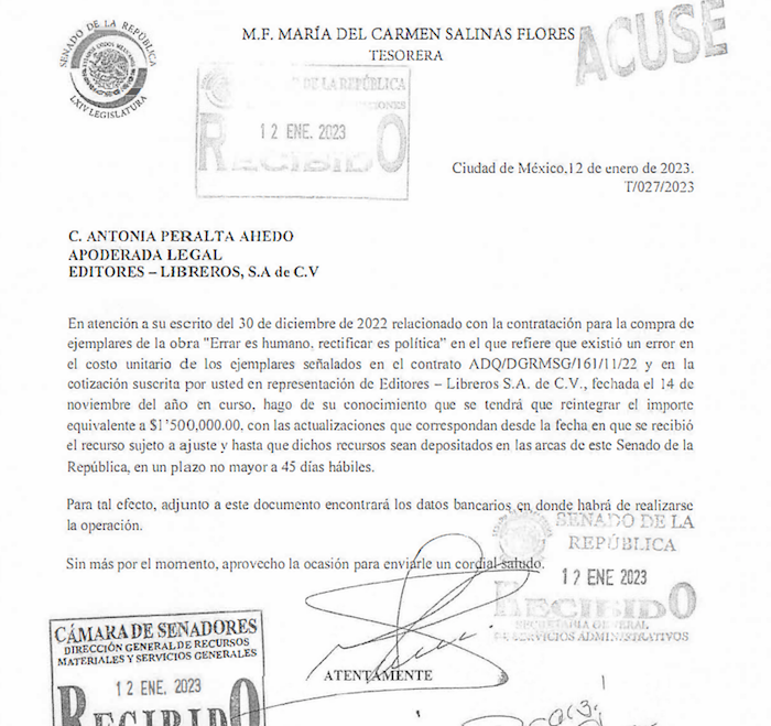 “Este es un oficio de diciembre. Luego hay otro del 30 de diciembre, en el que la Editora acepta que se equivocó, y nosotros también, y dice: "que por error en la elaboración del presupuesto [...] se señalaron mil ejemplares a un costo de 2 mil pesos en vez de los 4 mil ejemplares a un costo unitario de 500 pesos”, agregó el Senador.