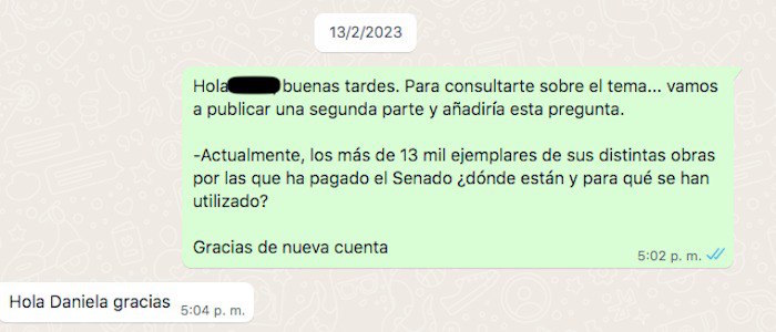 “El Senado tiene una política editorial, no sólo son esos seis libros; en ese tiempo (2021-2022) el Senado ha editado más de 60 libros de distintos autores. No es comprarme a mí la obra, al contrario, yo cedo los derechos al Senado como autor. Lo que se hace es pagarle a la editorial que edita esos libros. Los libros se regalan y se puede demostrar fácilmente con videos de jóvenes que vienen al Senado y se les regala mi obra”, comentó.