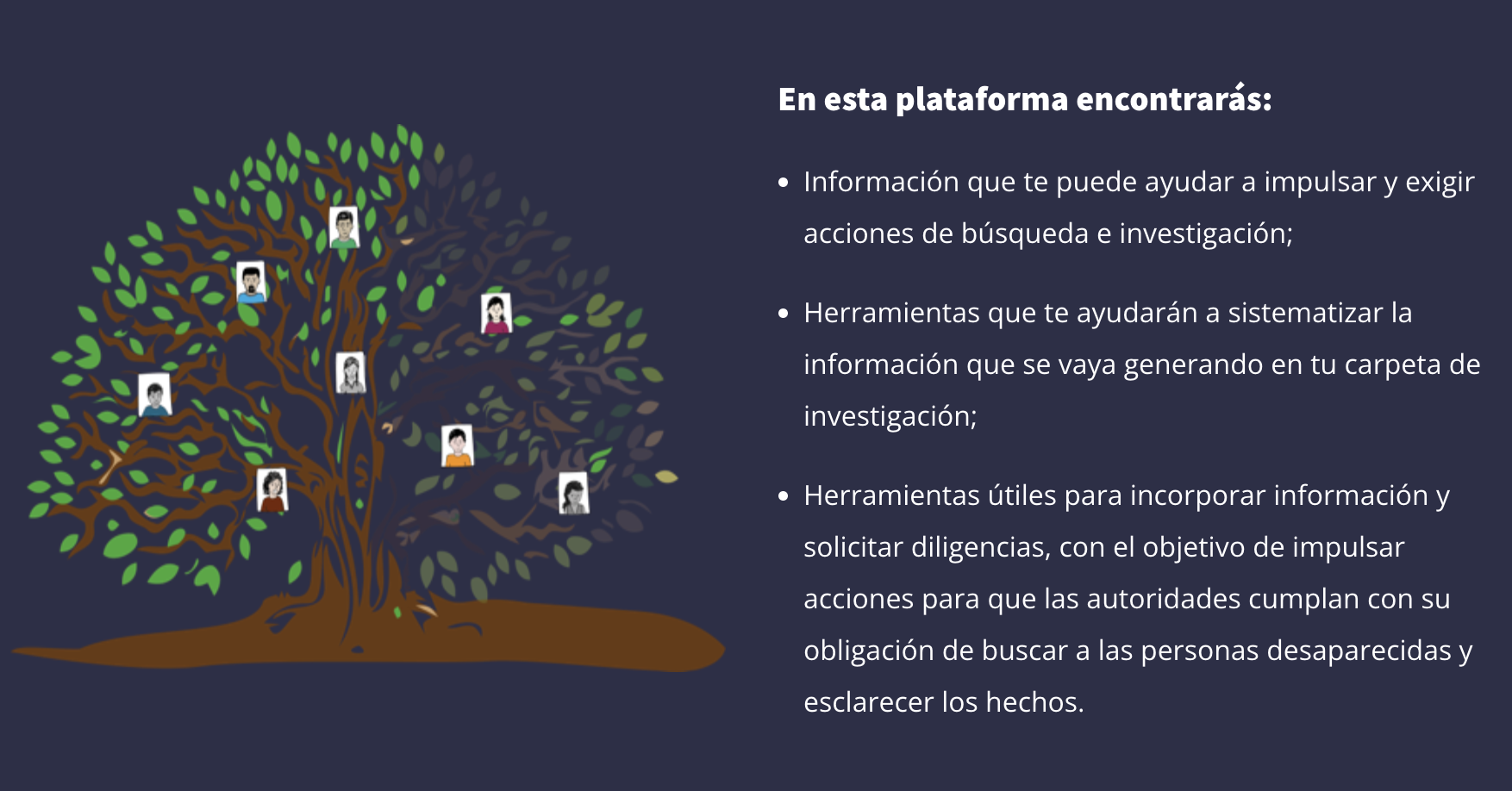 Esta guía digital ofrece a familiares de desaparecidos información y herramientas legales para dar debido seguimiento a las carpetas de investigación sobre sus seres queridos, pues muchas veces estas familias no cuentan con conocimientos jurídicos o asesoría legal.