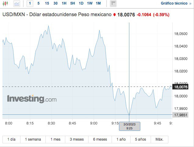 A lo largo de la jornada, el peso tocó un nivel mínimo de 17.96 unidades y un máximo de 18.12 unidades por dólar.