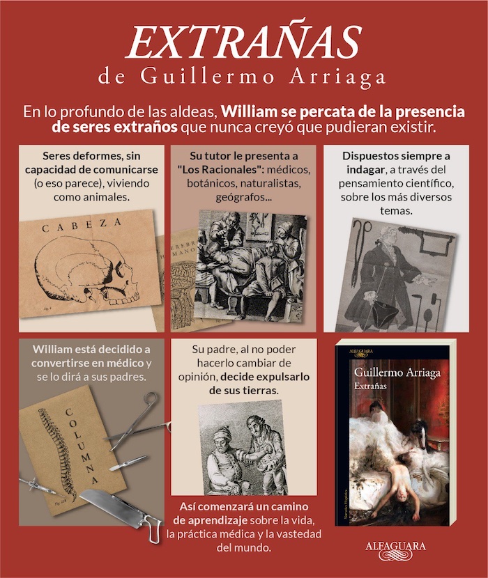 —Las Extrañas, la novela debe su nombre a unas personas que físicamente son distintos a cualquier ser humano o que puedas imaginar y es muy raro que este tipo de personas nazcan. No me estoy refiriendo ni a lo mágico, ni a lo místico ni nada, me refiero a que físicamente son muy diferentes a cualquier persona y nacen casi cada 300 años, no son comunes, son seres muy poco comunes y a mí de pronto en un viaje me llegó la idea de platicar de estos seres extraños, así deben su nombre, así les dicen en Inglaterra del siglo XVIII, son extrañas porque no hay nadie como como ellas y yo quería narrar la historia en distintos países, en diferentes épocas: en Mongolia, en el siglo X; en Noruega, en el siglo XV; en Inglaterra, en el siglo XVIII; en México, en siglo XXI.