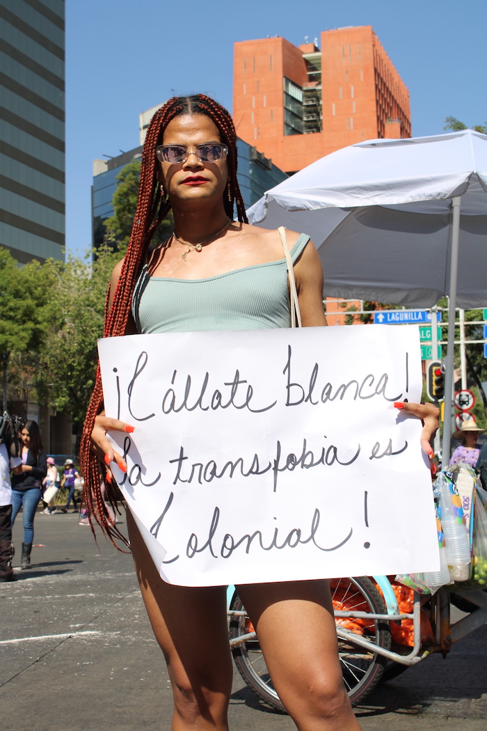 "Estoy aquí porque el feminismo tranfóbico blanco institucional hegemónico que cada día está más de moda en este país, y que está plagado y que prolifera en las calles y las redes sociales no va tener más nuestro silencio. Nos hemos dado cuenta que el feminismo tranfóbico está construyendo una narrativa que justamente nos criminaliza, nos estigmatiza, y es un feminismo profundamente blanco que niega la pluralidad corporal de nosotras. Nosotras las mujeres somos de muchas formas. Nosotras ls mujeres trans no queremos ser mujeres a secas, sin apellidos, porque ser 'mujer a secas' es una violencia, las mujeres somos migrantes, las mujeres somos negras, las mujeres somos comunitarias, las mujeres somos afrodescendientes, somos cis, somos trans, las mujeres tenemos una ubicación en el mundo y que nos nieguen a nosotros es violencia racista. La transfóbia es una herencia colonial eso de que solamente hay hombres y mujeres cis, y no hay otra manera de existir en el mundo, es una violencia", destaca para SinEmbargo.
