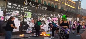 Hasta después de las 18:30 horas los contingentes seguían llegando frente a Palacio Nacional, cubierto con vallas de metal que desde ayer fueron intervenidas por mujeres que escribieron con pintura blanca los nombres de víctimas de feminicidio y desapariciones por las que exigen justicia.