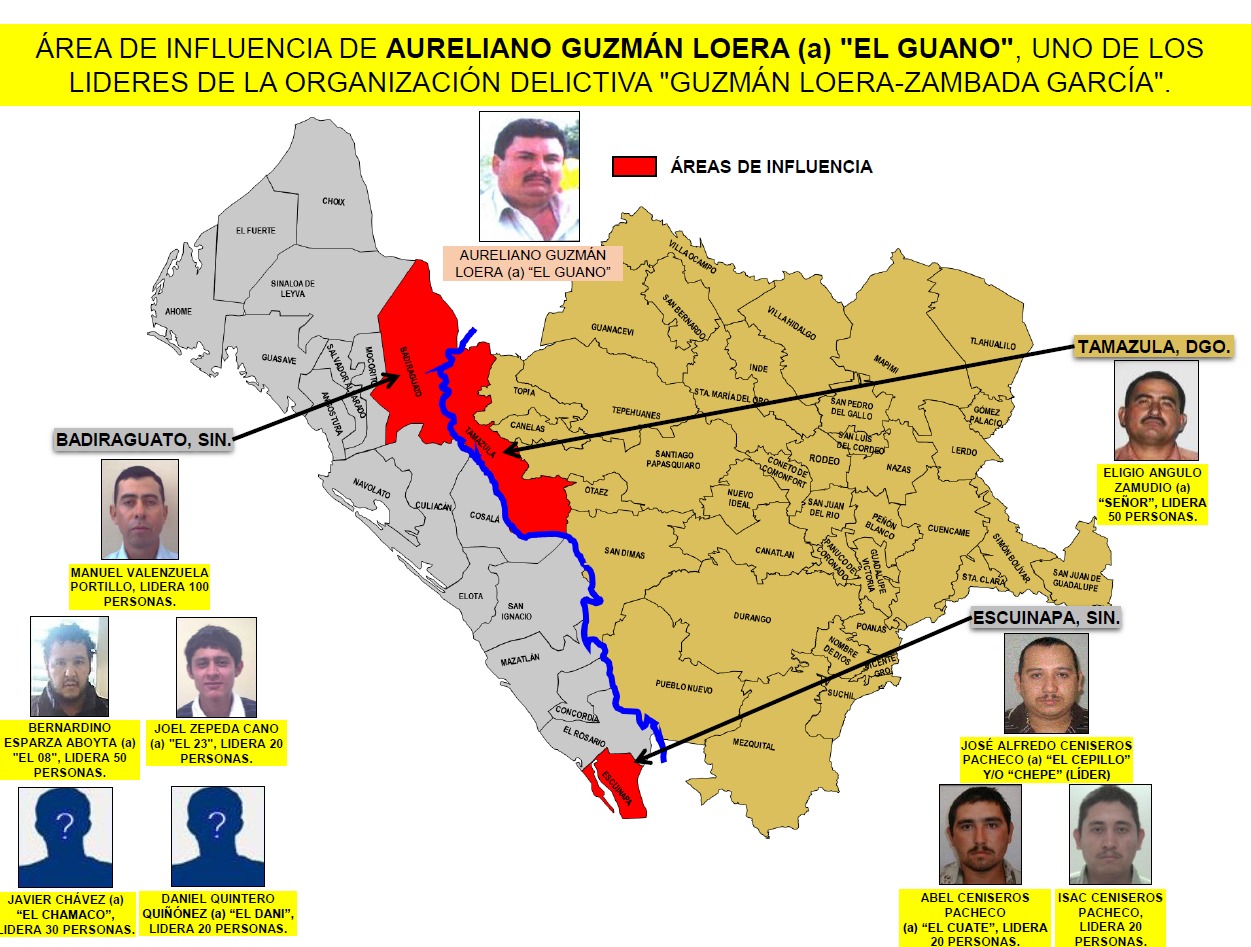 La información sobre la red de vínculos de Aureliano Guzmán Loera, elaborada por las áreas de inteligencia de la Sedena, establecen también un mapa de Sinaloa y Durango, con una fotografía del Guano en la parte superior y en rojo las áreas bajo su influencia: Badiraguato, Tamazula y Escuinapa. Ahí se detallan las jerarquías dentro de la organización “Guzmán Loera-Zambada García”.