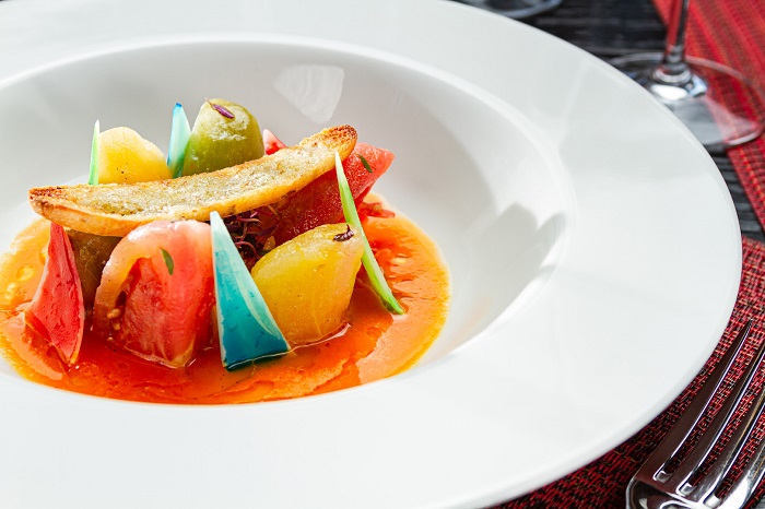 Entre los platillos se encuentra Sinfonía de jitomates heirloom infusionado con aceite de oliva y vaina de vainilla acompañado de gazpacho y queso manchego; otro es acuarela de betabeles con salmón gravlax acompañado de jitomate cherry y mayonesa de colores; robalo con arcoiris de papa acompañado de chocrut; además de trilogía de bizcocho y mousse acompañado de sorbete de mango.
