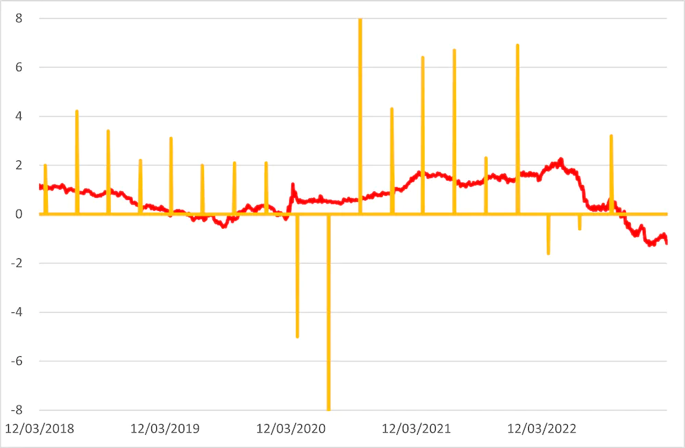 Sin embargo, cabe también la posibilidad (contraintuitiva) de que los tipos a corto plazo sean mayores que los tipos de interés a largo plazo. Y esta es precisamente la situación actual del mercado de deuda pública de Estados Unidos. Hemos recogido la diferencia entre los tipos de interés a 10 años y los tipos de interés a tres meses del mercado estadounidense: