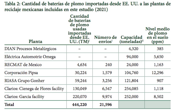 Clarios, el mayor fabricante de baterías de automóviles del mundo, fue responsable del 68 por ciento de todas las exportaciones de baterías de plomo usadas enviadas desde EU a México en 2021. Precisamente una de las instalaciones más contaminantes fue la de Ciénega de Flores que tuvo una concentración media de plomo en el suelo de 1,118 ppm, dice el reporte.