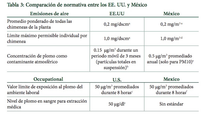 Además México actualizó la norma para el control de emisiones atmosféricas en la fundición secundaria de plomo (Norma Oficial Mexicana NOM-166- SEMARNAT-2014) luego de la publicación del informe de la CCA, pero la regulación permitió un período de ocho años de transición para lograr que las empresas cumplieran con el límite máximo permisible de 0.2 mg/m3 de plomo con muestreo trimestral requerido.
