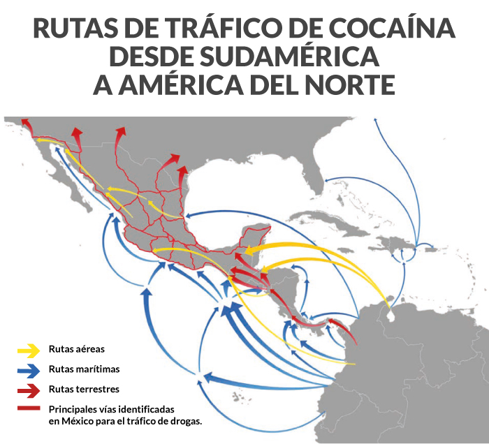La cocaína llega a México desde Sudamérica por diferentes modos: vía marítima, especialmente en lanchas rápidas; a través de vuelos clandestinos; y también por tierra, dice el reporte. Las rutas de trasiego por mar se dan sobre todo a través de la costa del pacífico mediante distintas rutas que llevan directamente a las costas mexicanas de los estados de Chiapas, Oaxaca, Guerrero, Michoacán Jalisco y Sinaloa, mientras que otros tocan tierra más al sur en países centroamericanos como Guatemala, El Salvador, Nicaragua, Costa Rica y Panamá antes de continuar el viaje hacia Estados Unidos.