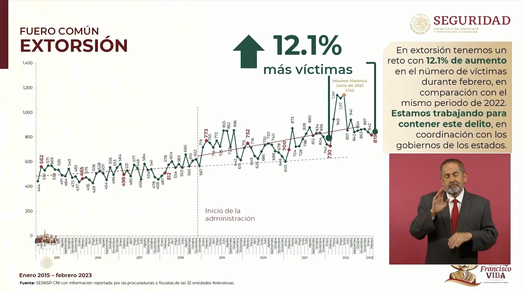 Además, la titular de la SSPC destacó el detrimento del secuestro y la extorsión, 65.4 y 12.1 por ciento, respectivamente. Del primero, aunque baja en comparación con el inicio de la actual administración, 64 secuestros es el mayor número de secuestros desde mayo del año pasado. Del segundo, en referencia con el mismo periodo, ha aumentado un 44.4 por ciento, aunque Rosa Icela Rodríguez comparó con febrero 2022, en el que de todas maneras, incrementó sólo en 12.1 por ciento, el número de víctimas de extorsión.