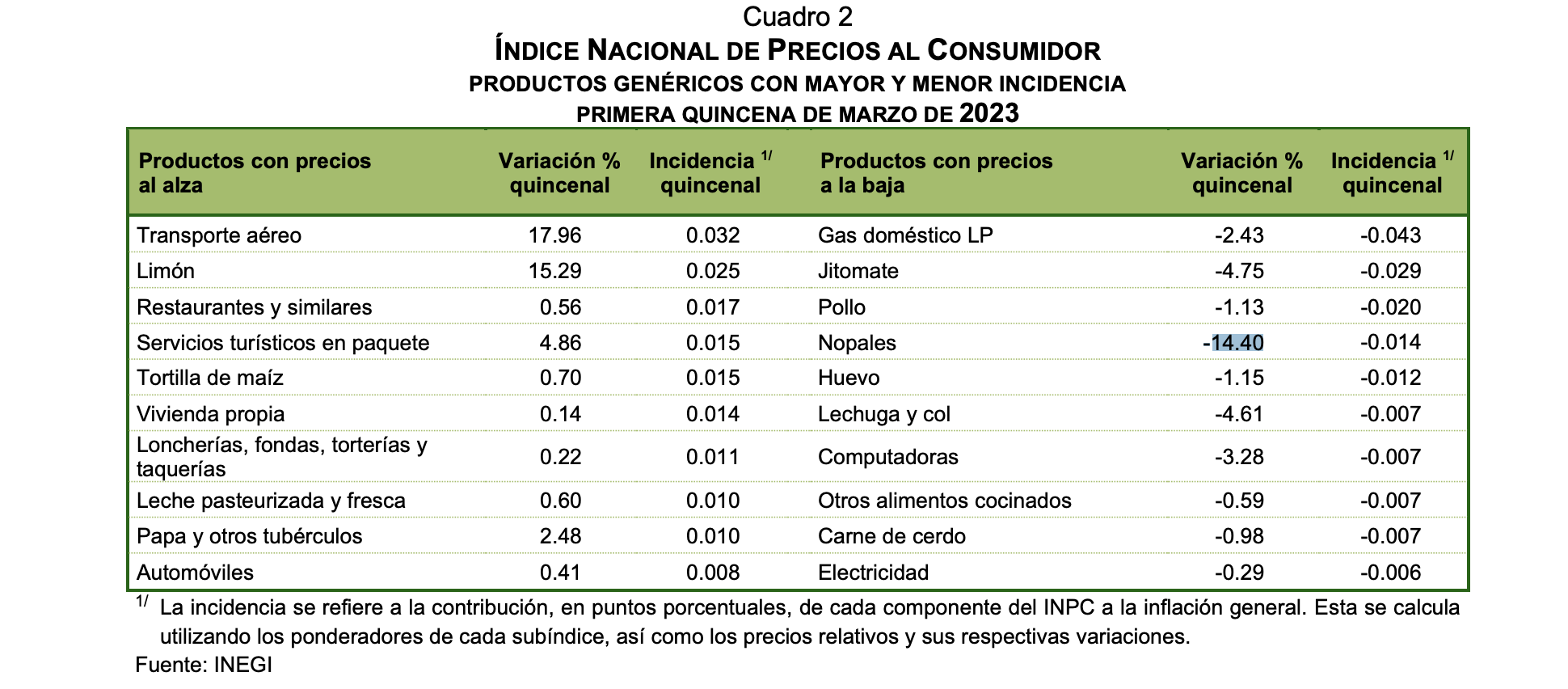 Entre los productos con precios a la alza se ubicó el transporte aéreo, con una variación del 17.96 por ciento con respecto a la última quincena; el limón, con un aumento del 15.29 por ciento; y los restaurantes y similares, con un alza del 0.56 por ciento.