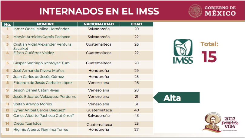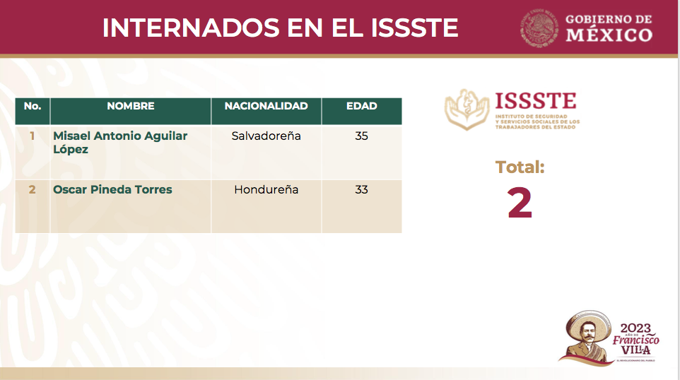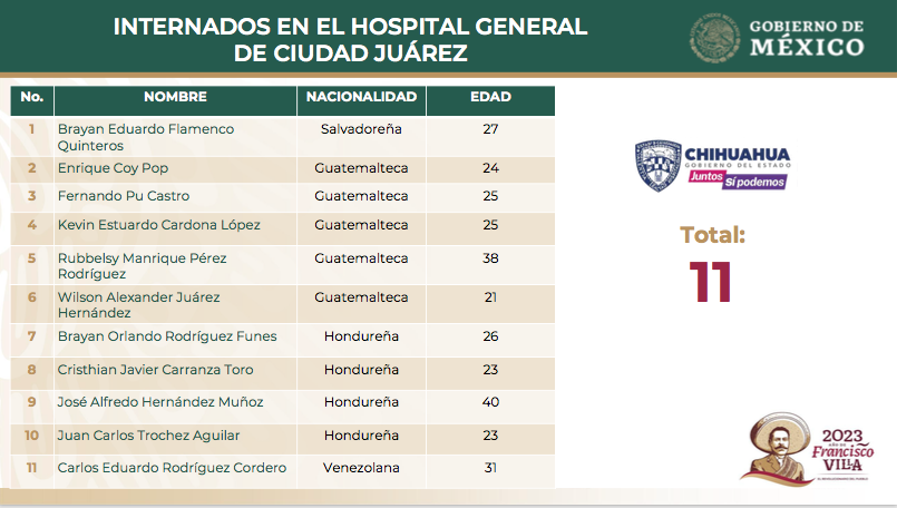 La Secretaria den Seguridad informó que se tiene el registro de que de las 28 personas heridas: cinco son de origen salvadoreño, 10 guatemalteco, ocho hondureño y cinco venezolano. De ellas, 27 permanecen hospitalizadas y una fue dada de alta.