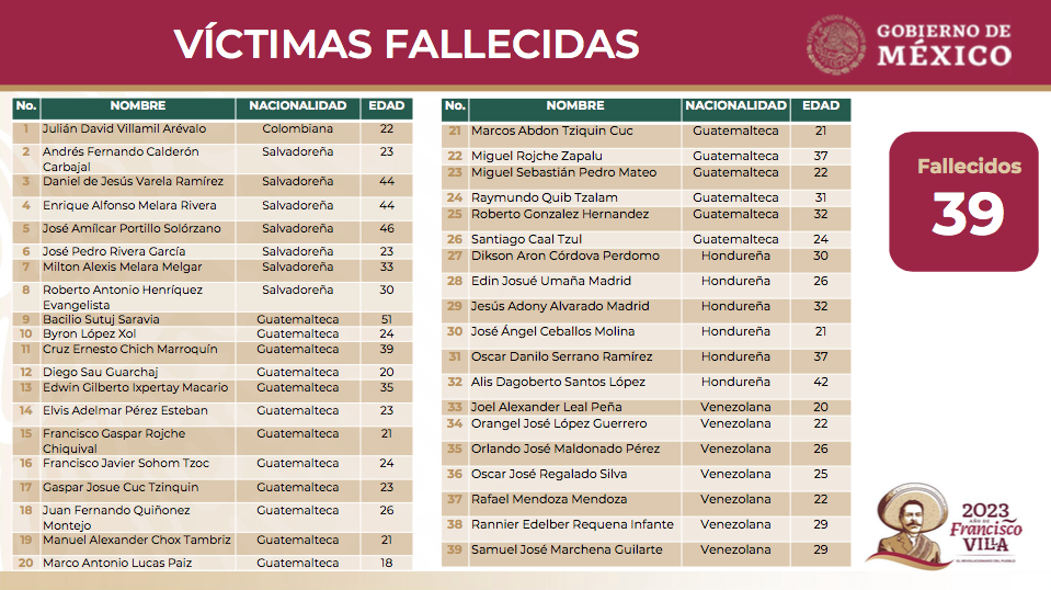 De las 39 personas fallecidas, seis son de nacionalidad hondureña, siete salvadoreña, 18 guatemalteca, una colombiana y siete venezolana.