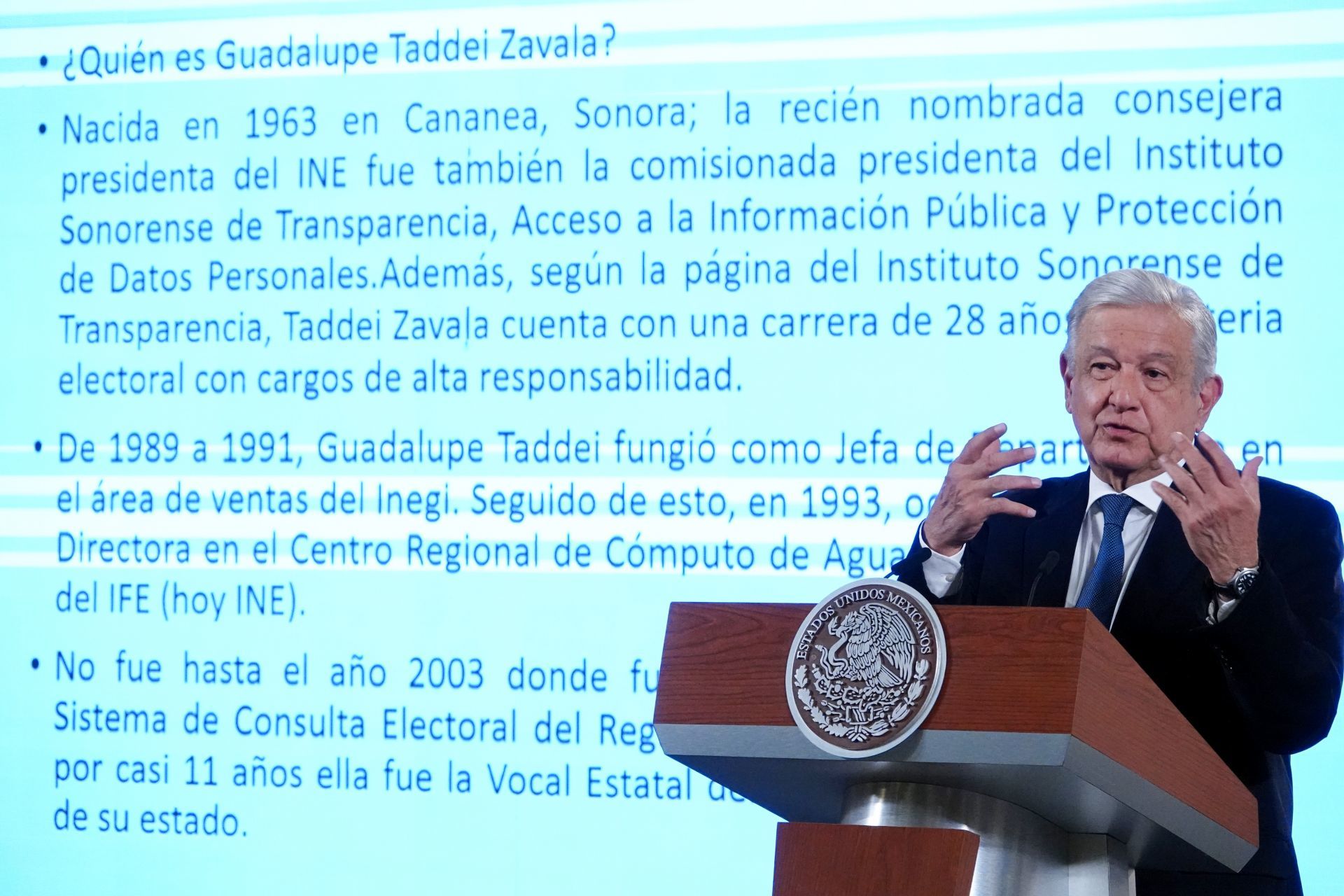 Sobre la nueva Consejera presidenta del INE, Guadalupe Taddei Zavala, quien se convirtió la madrugada de este 31 de marzo en la primera mujer que presidirá el Instituto Nacional Electoral (INE) desde que surgiera como Instituto Federal Electoral (IFE) en 1990, dijo que era una "mujer experimentada".