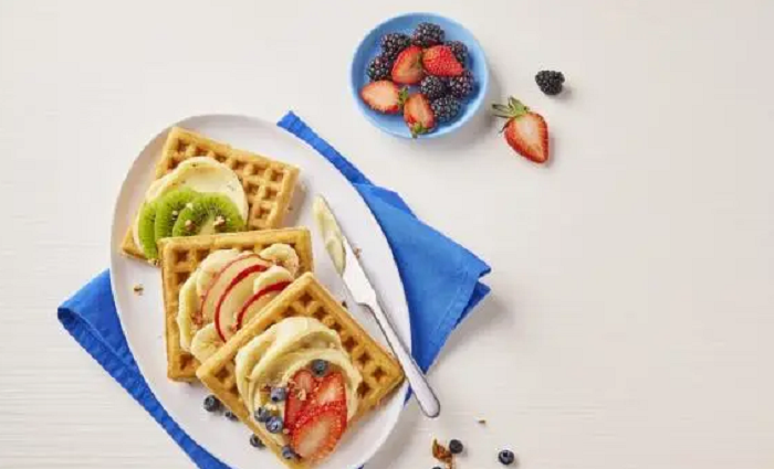 3.- cubre cada waffle con un poco de Leche Condensada La Lechera, decóralos con un poco de fresas, moras azules, manzana, y nuez.