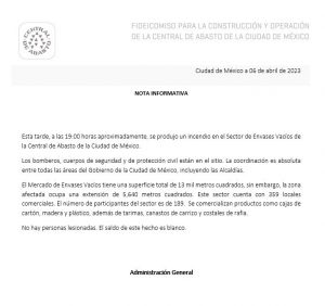 La Administración General del mercado dio a conocer en un comunicado que el incendio se produjo en el Sector de Envases Vacíos, donde Bomberos, cuerpos de seguridad y de Protección Civil continúan trabajando, en coordinación con las autoridades de las diferentes áreas del Gobierno capitalino y de las alcaldías.