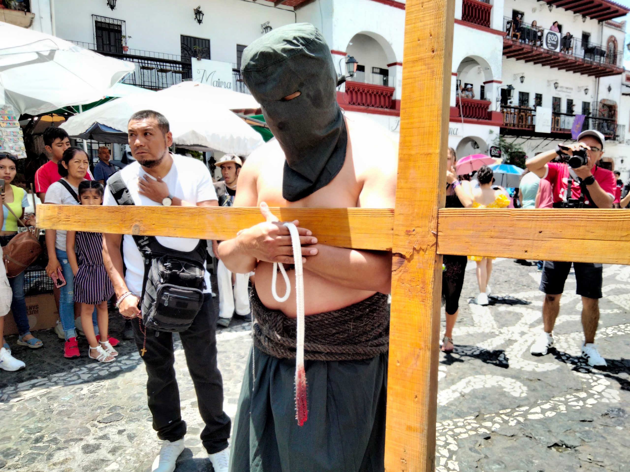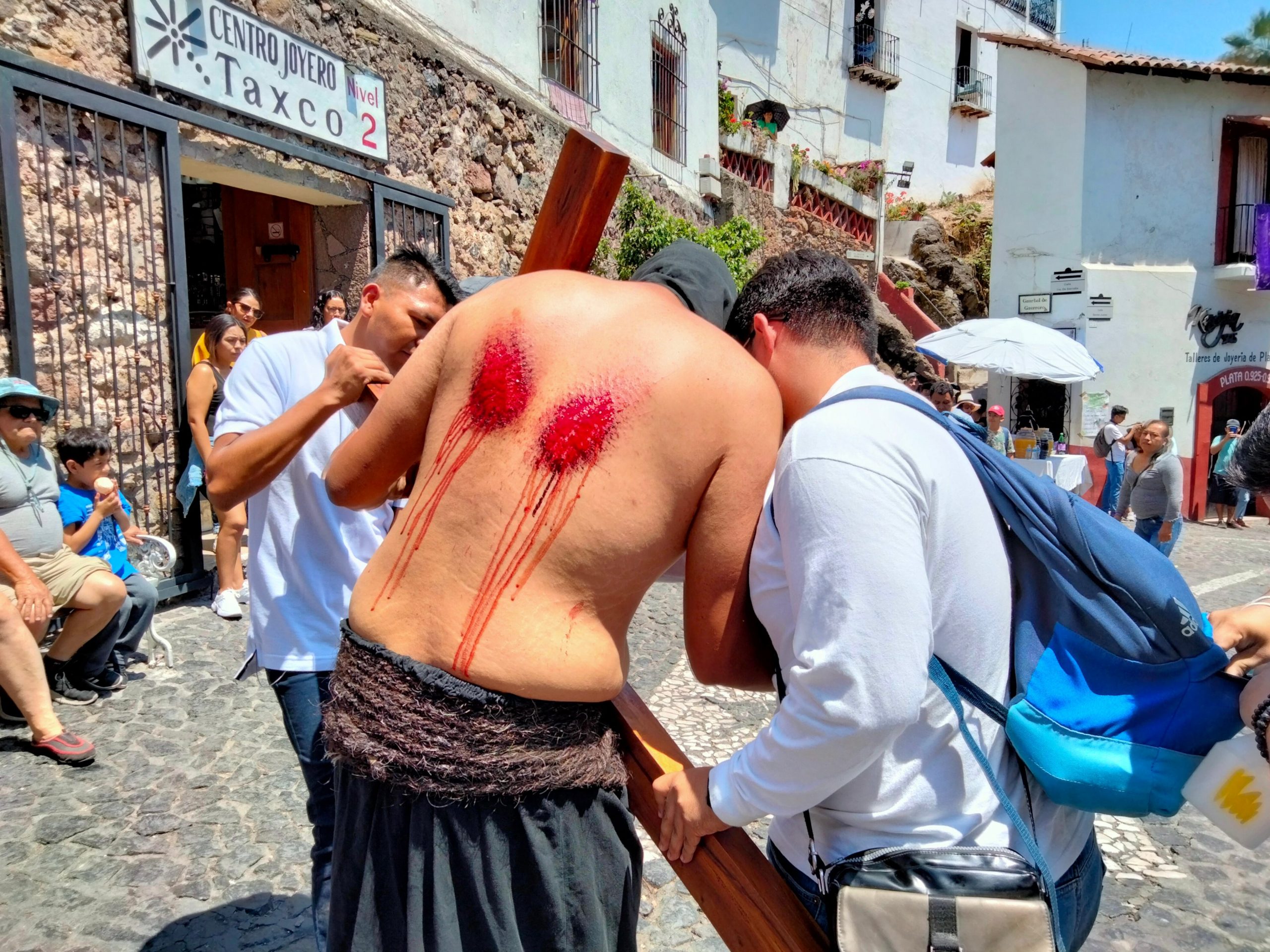 A las 10 de la mañana, del viernes, el zócalo de Taxco luce aún más lleno, hay pocos huecos, pues los visitantes siguen llegando en busca de observar ahora el Viacrucis. Los penitentes, las ánimas y los flagelantes salen a su segundo recorrido y esta vez el castigo aumenta, porque el sol que pega fuerte, calienta las calles empedradas, y su marcha descalzos se hace eterna y muy lenta su avance, hasta necesitar cada diez pasos que sus ayudantes les ayuden para soportar el cansancio, varios se estremecen y otros cuantos desisten.