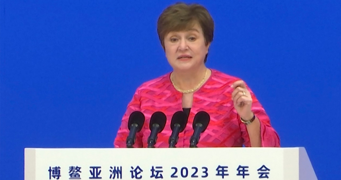 En esta imagen tomada de un video, la directora gerente del FMI, Kristalina Georgieva, habla en la ceremonia de apertura del Foro Boao para Asia en Boao, China, 30 de marzo de 2023. Foto: Dake Kang, File, AP