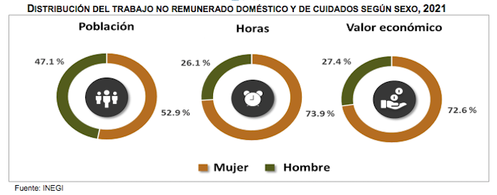 Esto, debido a que las mujeres destinaron el 73.9 por ciento de su tiempo a labores no remuneradas y de cuidado, lo que representó un valor económico del 72.6 por ciento, en comparación con los hombres, quienes destinaron a labores no remuneradas y de cuidado el 26.1 por ciento de su tiempo, lo que representó un valor económico del 27.4 por ciento.