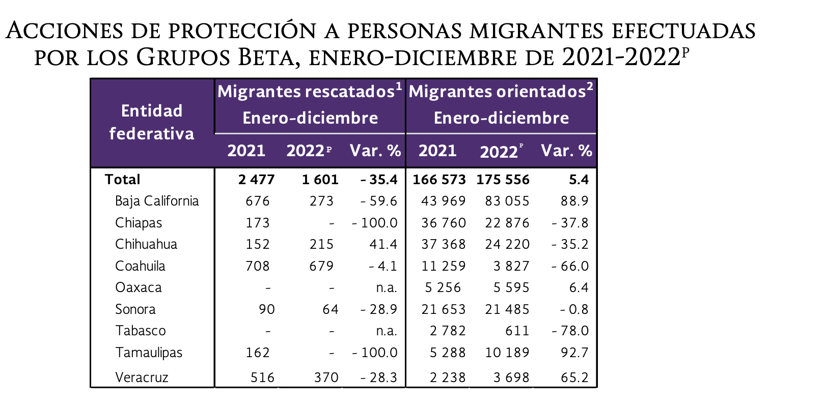 Por otra parte, en las cifras que presenta el propio INM en su informe anual "Estadísticas Migratorias" que se encuentra en el portal de Política Migratoria  se señala que durante el año 2022, integrantes del Grupo Beta del INM rescataron en total a 1 mil 601 migrantes, la mayoría de estos en el estado de Coahuila con un total de 679 rescatados, 370 en Veracruz, 273 en Baja California, 215 en Chihuahua y 64 en Sonora. La cifra total, de acuerdo con la estadística, es menor a la registrada en 2021, en el que reporta un total de 2.477 migrantes rescatados, la mayoría en los estados de Coahuila (708), de Baja California (676) y Veracruz con 516.