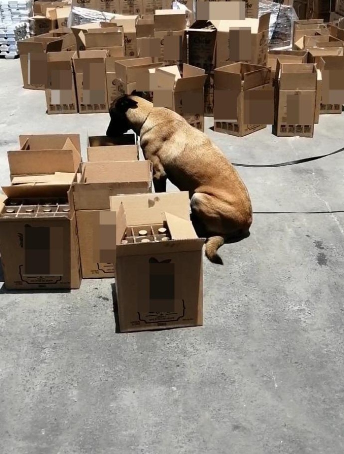 Fotografías del incautamiento muestran a un perro entrenado que alerta a los inspectores hacia cajas de cartón repletas de botellas de vidrio que contenían un líquido color marrón, similar al tequila añejo. No se podían ver las etiquetas en las botellas.
