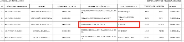 La PNT también alberga licencias de construcción y autorizaciones otorgados por la Alcaldía de Saltillo a la empresa familiar Jisa Bienes Raíces en 2018, 2019, 2020 y 2021, pero no es posible acceder al link que muestra los documentos sobre de qué tipo de fraccionamiento u obra se trata.