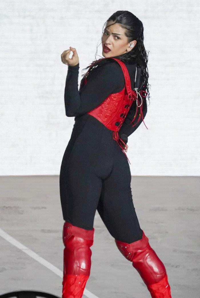 Pero finalmente la emoción explotó cuando Rosalía salió al escenario con ropa entallada negra sobre la cual llevaba un corsé escarlata con flores repujadas y botas a juego. Eran casi las 8:30 de la noche y abrió su concierto con “Saoko”. Rosalía presentó una versión masiva (con un ritmo sin cesar y sin mucho parloteo) pero fiel del espectáculo con el que ha recorrido Europa y el continente americano, de Canadá a Argentina, incluyendo su reciente presentación en el festival Coachella de California, en una de las giras más lucrativas del mundo, según la publicación especializada Pollstar.