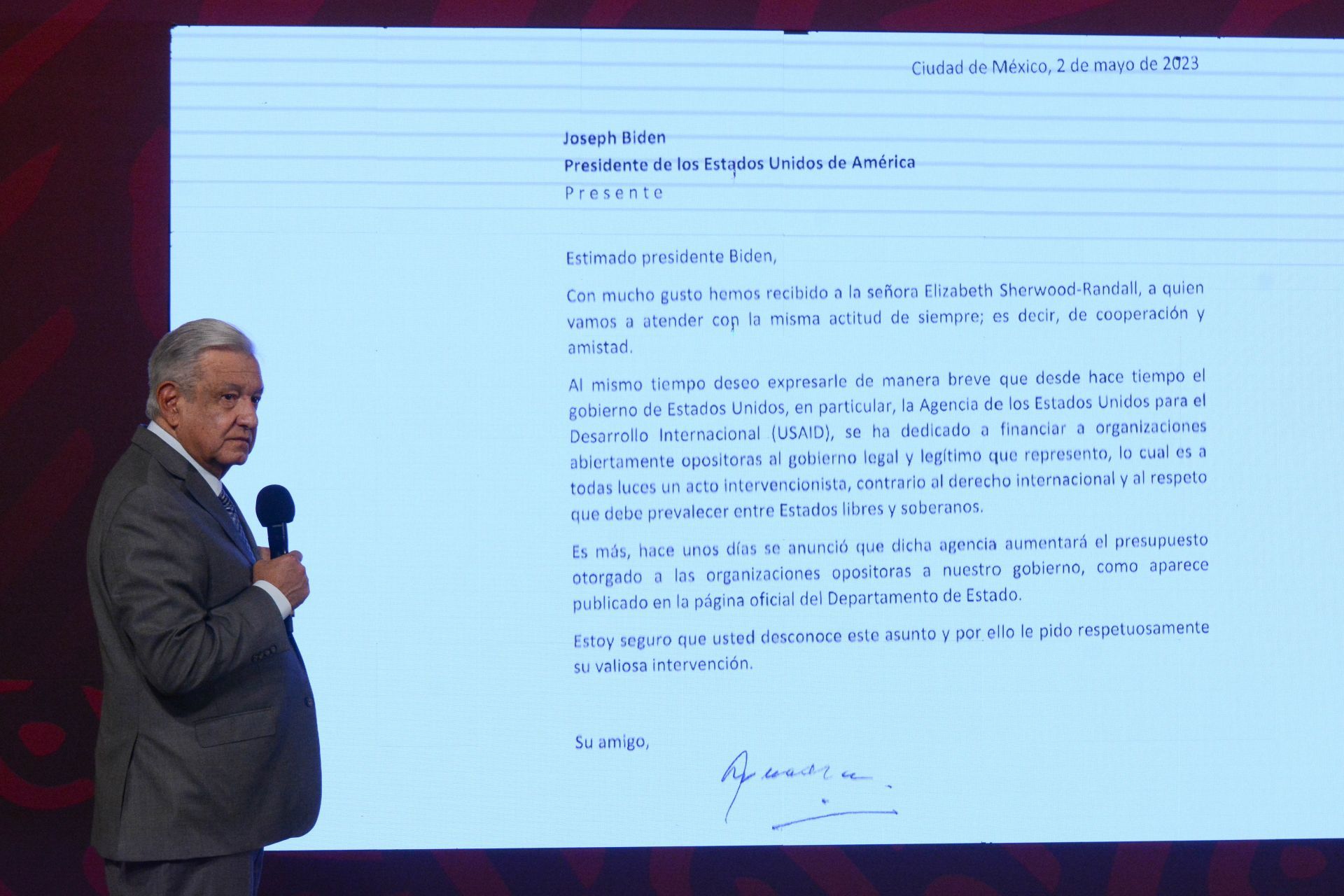 “Deseo expresarle de manera breve que desde hace tiempo el Gobierno de Estados Unidos, en particular, la Agencia de los Estados Unidos para el Desarrollo Internacional (USAID), se ha dedicado a financiar a organizaciones abiertamente opositoras al Gobierno legal y legítimo que represento, lo cual es a todas luces un acto intervencionista, contrario a derecho internacional y al respeto que debe prevalecer entre Estados libres y soberanos”, dijo en su conferencia matutina.