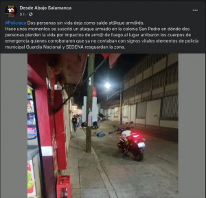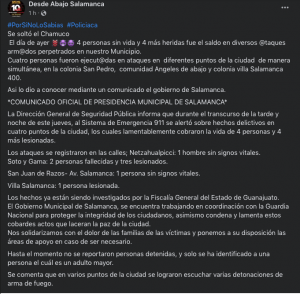 “El Gobierno Municipal de Salamanca, se encuentra trabajando en coordinación con la Guardia Nacional para proteger la integridad de los ciudadanos, asimismo condena y lamenta estos cobardes actos que laceran la paz de la ciudad.