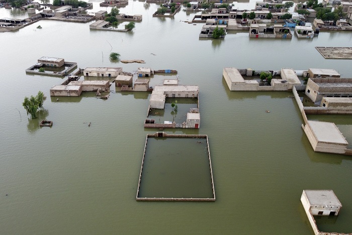 Varias viviendas, aisladas por las inundaciones en Jaffarabad, un distrito de la provincia de Baluchistán, en el sur de Pakistán, el 1 de septiembre de 2022. Foto: Zahid Hussain, AP.