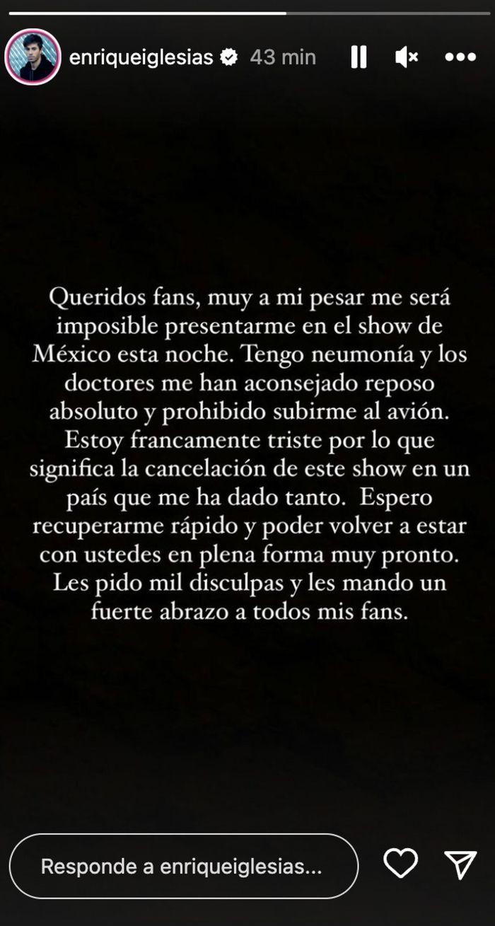 “Queridos fans, muy a mí pesar me será imposible presentarme en el show de México esta noche. Tengo neumonía y los doctores me han aconsejado reposo absoluto y prohibido subirme al avión. Estoy francamente triste, por lo que significa la cancelación de este show en un país que me ha dado tanto. Espero recuperarse rápido y poder volver a estar con ustedes en plena forma muy pronto. Les pido mil disculpas y les mando un fuerte abrazo a todos mis fans”, se lee en la historia.