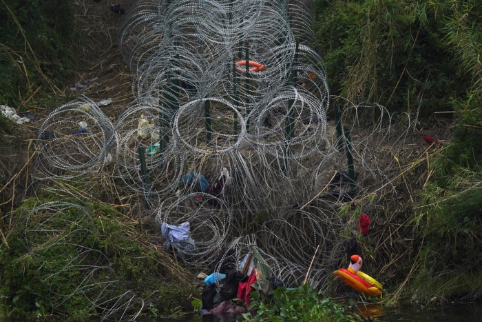 Migrantes pasan a través de alambre de púas colocado a la orilla del río Bravo, donde elementos de la Guardia Nacional de Texas les piden que no crucen. Foto: Fernando Llano, AP.
