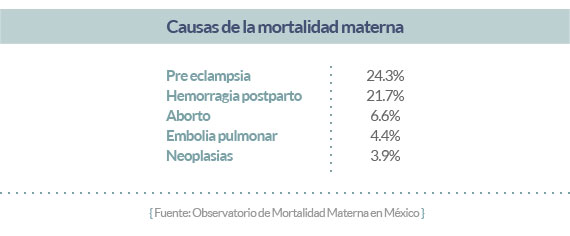 El Observatorio de Mortalidad Materna en México, revela que una de las principales causas de muerte materna es la pre eclampsia con el 24.3 por ciento, en segundo lugar se encuentra la hemorragia postparto con el 21.7 por ciento, mientras que el aborto, la embolia pulmonar y la neoplasias tienen el 6.6, 4.4 y 3.9 por ciento, respectivamente.