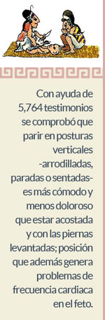 Tras documentar cinco mil 764 testimonios se comprobó que parir en posturas verticales –arrodilladas, paradas o sentadas- es más cómodo y menos doloroso que estar acostada con las piernas levantadas. En esa posición se generan problemas de frecuencia cardiaca fetal, sino también el uso de fórceps para sacar al recién nacido.