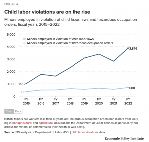 El Instituto de Política Económica ha ido más allá incluso. De acuerdo con su reporte de marzo de 2023, el número de menores contratados ilegalmente incrementó 37 por ciento en el último año y explotó un 283 por ciento desde 2015.
