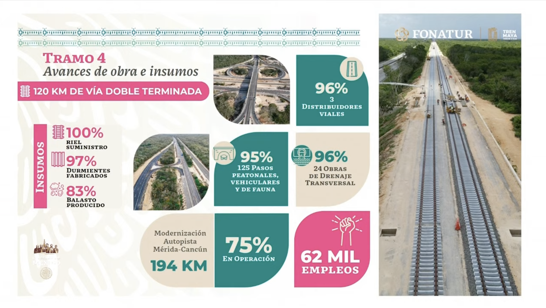 May informó unos momentos antes que el Tramo 4 del Tren Maya, que va de Izamal a Cancún, ya tiene 120 kilómetros de vía doble terminados, de los 239 kilómetros de vía doble electrificada con los que contará ya en total. Ya se cuenta con 100 por ciento del suministro del riel, así como 97 por ciento de los durmientes fabricados y el 83 por ciento del balasto producido.