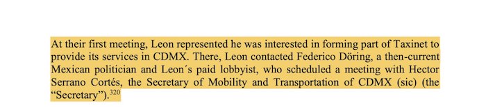 “En su primera reunión, León manifestó su interés en formar parte de Taxinet para brindar sus servicios en la CDMX. Allí, León se puso en contacto con Federico Döring, entonces político mexicano y cabildero pagado por León, quien programó una reunión con Héctor Serrano Cortés, Secretario de Movilidad y Transporte de la CDMX”.
